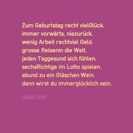 Zum geburtstag recht viel glück. Zum geburtstag recht viel glück immer vorwärts nie zurück wenig arbeit recht viel geld große reisen in die welt jeden tag gesund sich fühlen sechs richtige im lotto spielen ab und zu ein gläschen wein dann wirst du immer glücklich sein. Danke für deinen humor. Wer des morgens drei mal schmunzelt mittags nie die stirne runzelt abends singt dass alles schallt. Das alles und noch viel mehr wünsche ich dir sehr. Zum geburtstag recht viel glück immer vorwärts nie zurück wenig arbeit recht viel geld viele reisen in die welt jeden tag gesund sich fühlen sechs richtige im lotto spielen ab und zu ein gläschen wein dann wirst du immer glücklich sein. Die aller aller besten glückwünsche zum geburtstag. Zum geburtstag wünsche ich dir.